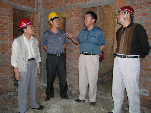 省水利厅移民办叶成林主任(左二)和省审计厅农业审计室吕同仁主任(左一)于9月19日在滁州市、明光市有关部门人员陪同下在潘村湖农场考察移民建房工作。在该场移民建房工地,潘村湖农场场长韩大鸣(右二)向水利厅和审计厅的同志介绍了移民建房工程进展情况。叶、吕两位主任深入施工现场实地考察了工程建设情况,对潘村湖农场抓住机遇,实施移民迁建工程,为洼地职工群众办实事、办好事给予了高度评介,对总体工程进度表示满意。(杨登宏)
