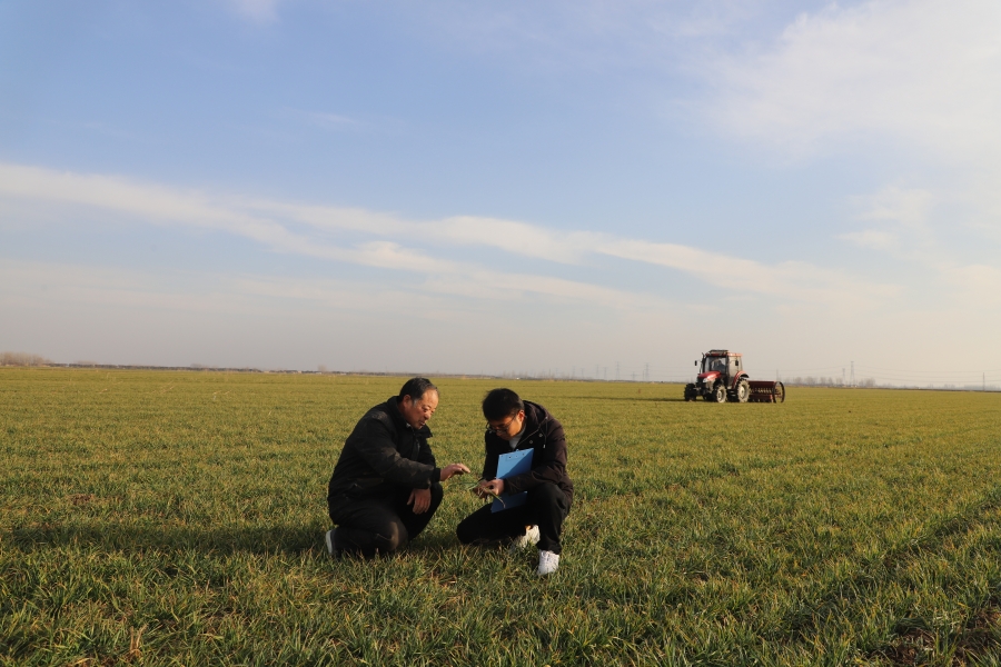 2月5日,在安徽省农垦集团龙亢农场科技园,农业技术人员正在检查试验田中小麦的长势。