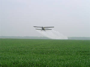 连日来,龙亢农场投入50多万元,用于3万亩小麦的 飞机防治作业,比人工作业每亩降低生产成本4-5元, 亩均增加产量80-100斤,预计整个两次的作业将持续 到4月底结束.图为飞防作业现场.+